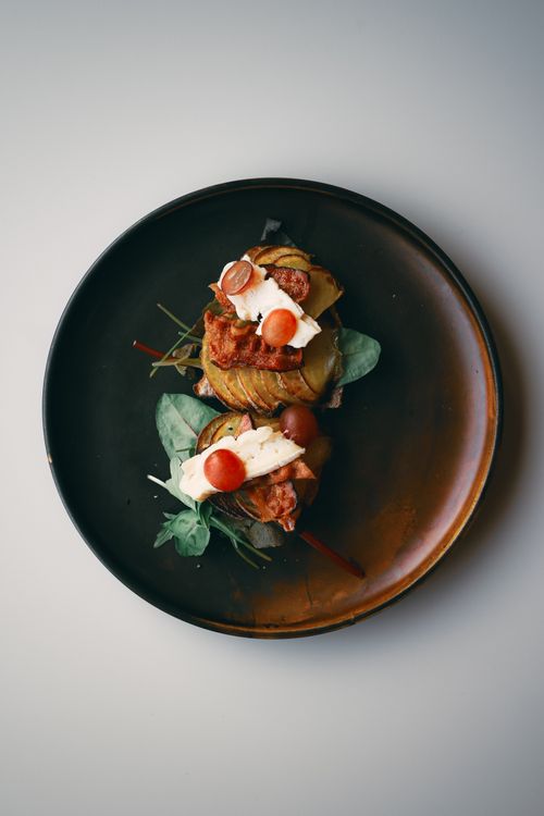 Stökkt beikon, brie ostur, pikkluð vínber og reyktar kartöflur